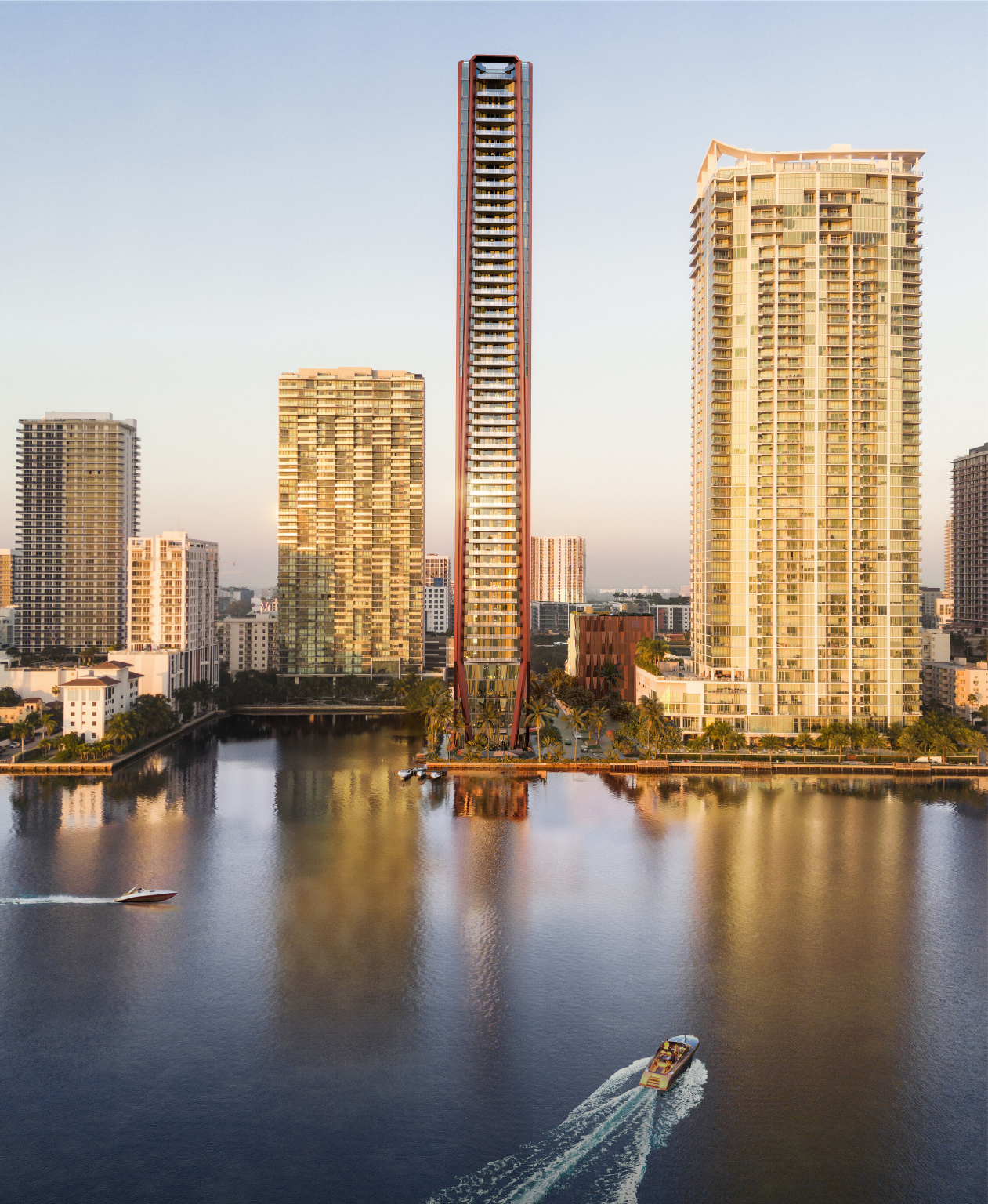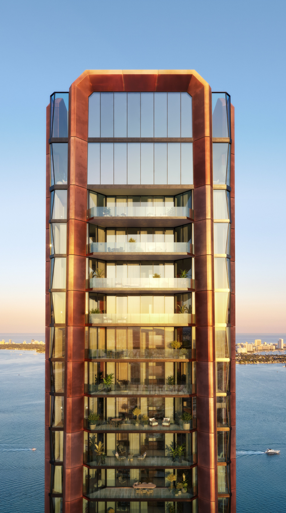 The building’s iconic design is defined by a sculptural bronze exoskeleton anchored by a multifaceted glass podium inspired by the form of a gemstone. Surrounding the tower, lush landscape design by Enzo Enea and waterfront grounds connected to the future Miami Baywalk create a seamless transition between architecture, nature, and the bay.